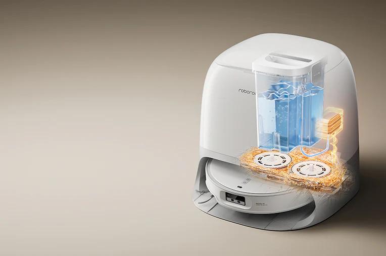 Qrevo CurvX’in Thermo+ Dock sistemi, her temizlik döngüsünden önce 80°C sıcak suyla mop pedlerini yıkayarak hijyen sağlıyor ve bunu tamamen kimyasal kullanmadan gerçekleştiriyor.